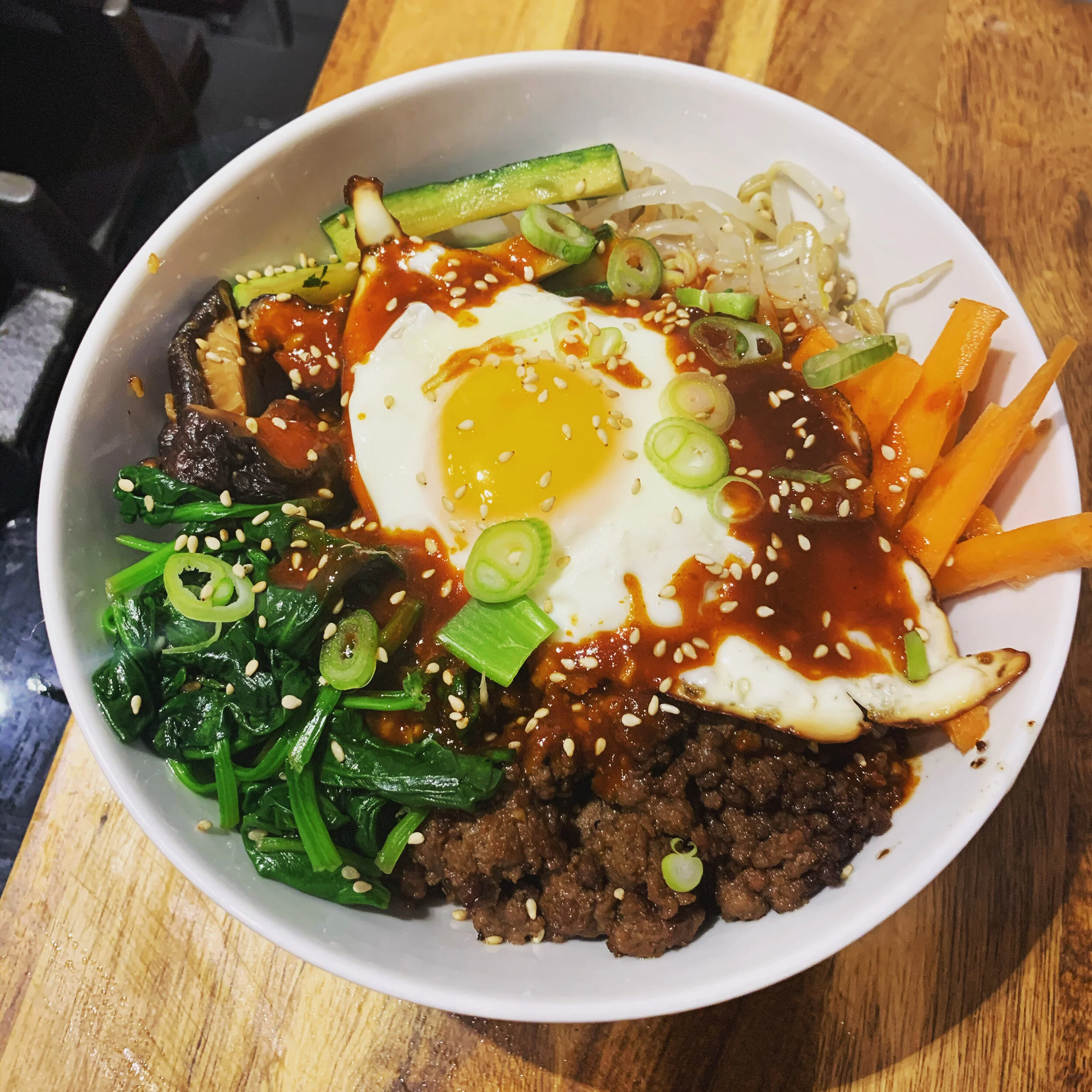 Bibimbap is a Korean rice dish which is usually a mix of meat and vegetables served on plain rice and then mixed up in to a jumble to eat. I like this version which comes with lashings of a spicy sauce made principally of gochujang, an intensely flavoured fermented hot pepper paste.